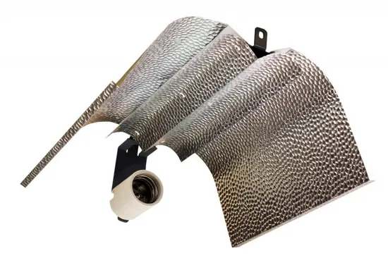 Воздух, нагретый лампой, поднимается вверх и отводится за пределы отражателя, что позволяет добиться меньшей температуры непосредственно под светильником. Это бывает крайне необходимо при ограниченной высоте и пространства для выращивания растений, а так же позволяет расположить рефлектор еще ближе к растениям. Отражатель выполнен из специального анодированного светотехнического алюминия Alanod, который имеет светоотражение 98%, а его ячеистая структура равномерно рассеивает свет от ламп, не создавая выжигающих линз на листьях растений. Патрон Е40, регулируемый по расстоянию от оси отражателя, позволяет установить и настроить правильное положение для лампы ДНАТ любой мощности. Кронштейн сделан из стали 2мм и покрыт защитным керамическим слоем, который гарантирует долгий срок службы изделия при использовании в помещении с высокой влажностью и в широком температурном режиме.