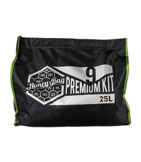Самый полный набор мешков Honey-Bag Premium KIT9 25L для ледяной экстракции смол и кристаллов с растений и цветов состоит из 9 мешков по 25 литров: одного рабочего, с размером ячеек сетки 225 микрон и восьми мешков-фильтров с сеткой 195, 160, 105, 125, 85, 65, 45 и 25 микрон.